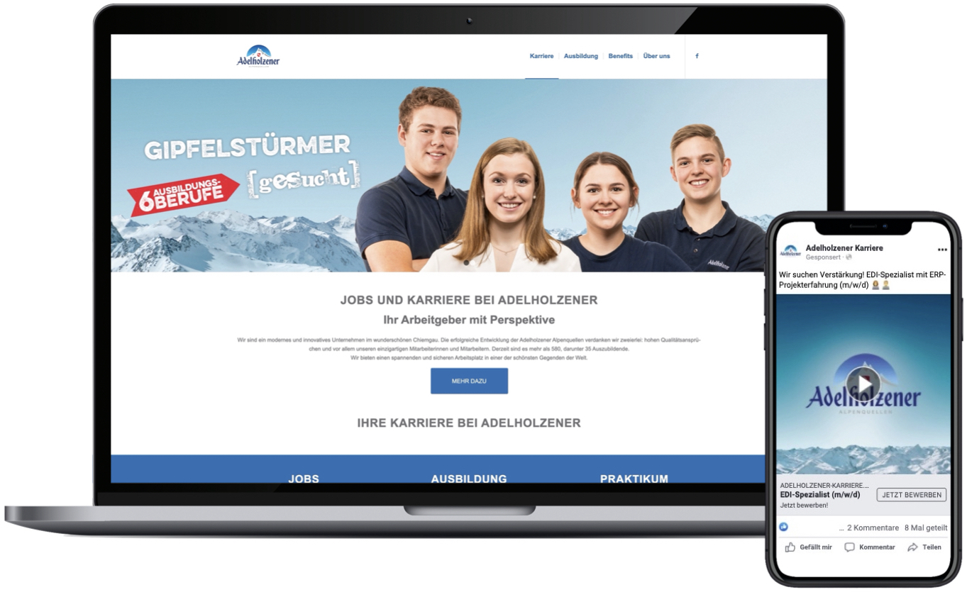 Das Konzept der Adelholzener Karriere Website überzeugt durch zielgruppenrelevante Inhalte und einfache Bedienbarkeit. Potentiellen Bewerber:innen wird es so leicht wie möglich gemacht sich zu informieren und zu bewerben. Für einen optimalen Bewerbungsprozess ist die Schnittstelle zur HR-Software vollumfänglich integriert. Gezieltes SEO und Online Marketing Kampagnen verhelfen zu effizienter und erfolgreicher Besetzung der offenen Positionen.
